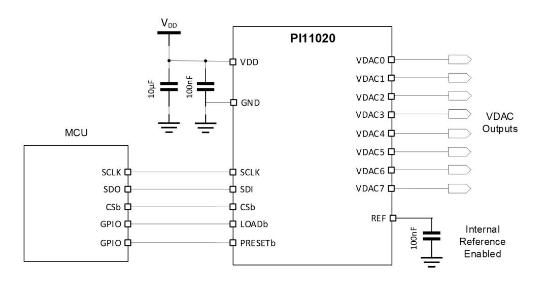 A flexible digital interface allows the DACs to be updated individually or together. The PI11020/21 will power-up with the DACs in power-down mode with high-impedance outputs to allow the output code and reference options to be programmed before enabling the DAC outputs.