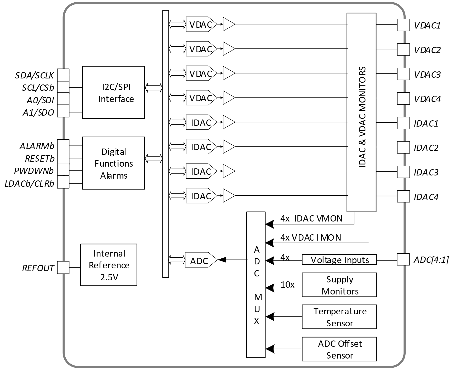 - 包含4个外部输入,DAC电压和电流监控以及温度监控